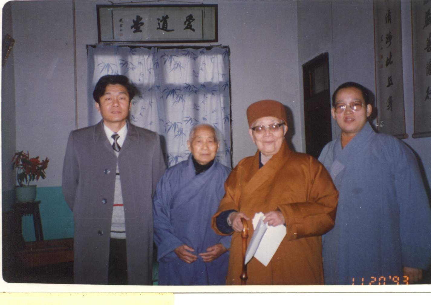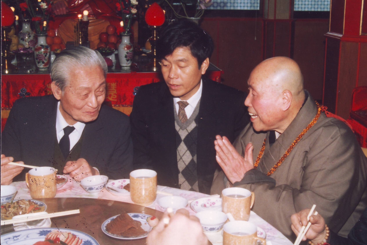 1993年1月,赵朴老与本焕、惟贤法师在明旸法师陪同下参访上海龙华寺