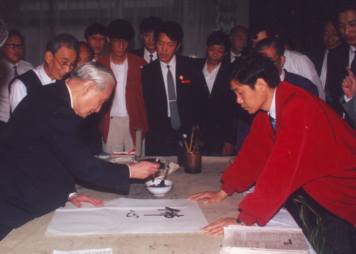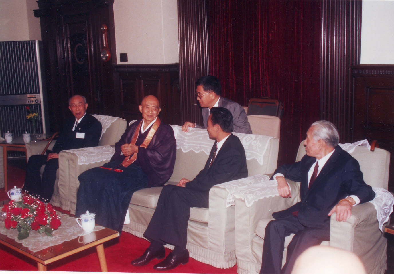 1993年5月21日时任上海市委书记吴邦国会见三位日本寿星(左起:庭野、山田、吴邦国、赵朴初)