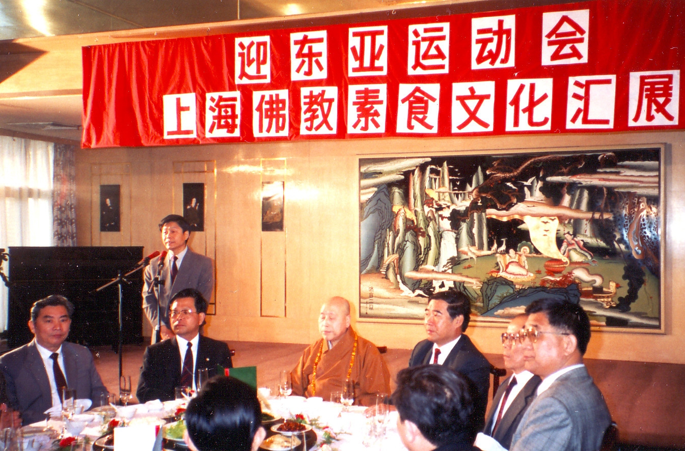 明旸法师和刘振元、龚学平副市长在素食文化展开幕式上