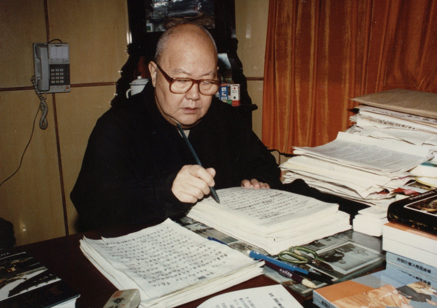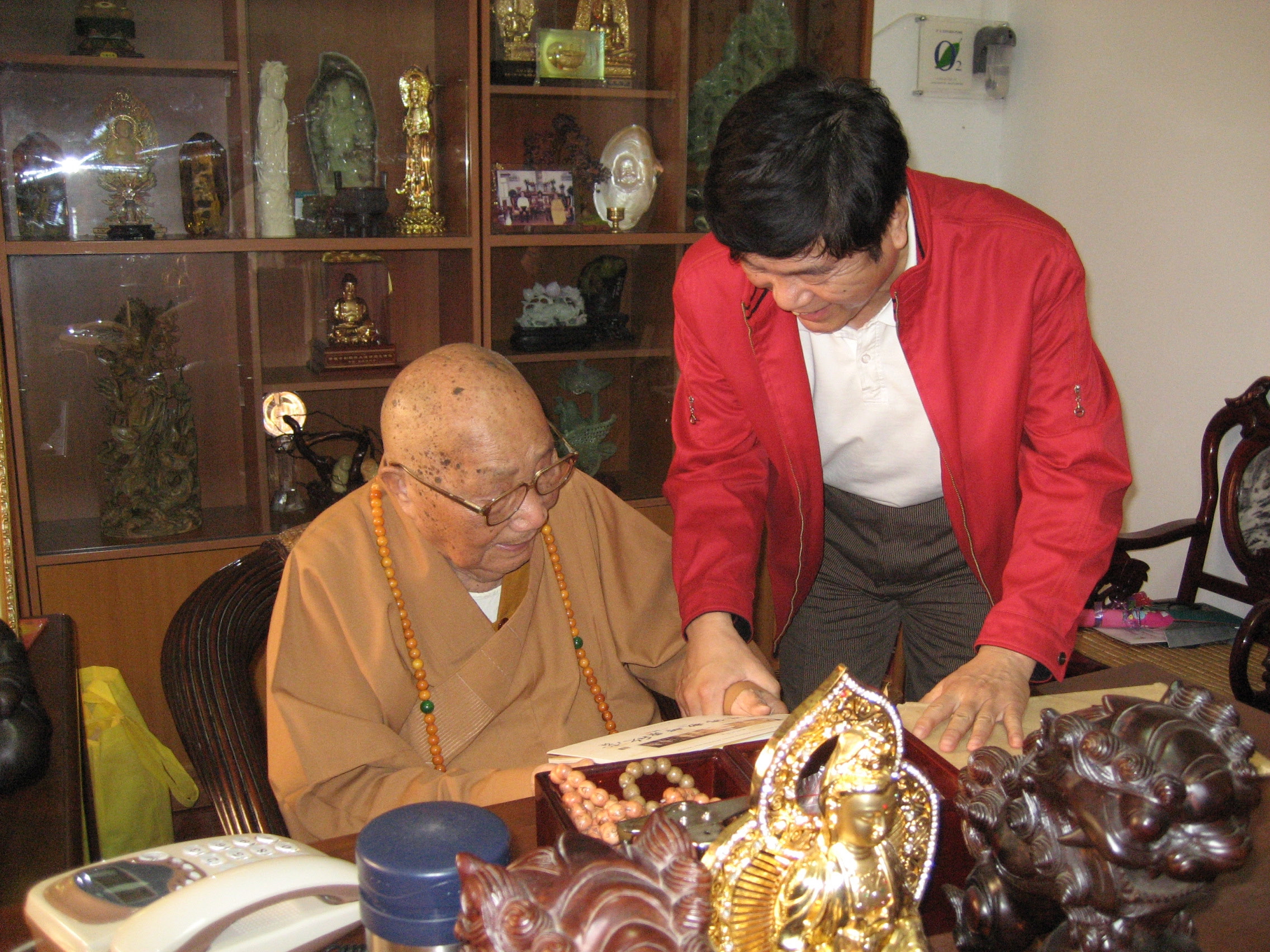 1993年3月,为举行日本三高僧祝寿事赵朴老亲自布置有关工作。左为天台山国清寺方丈可明法师