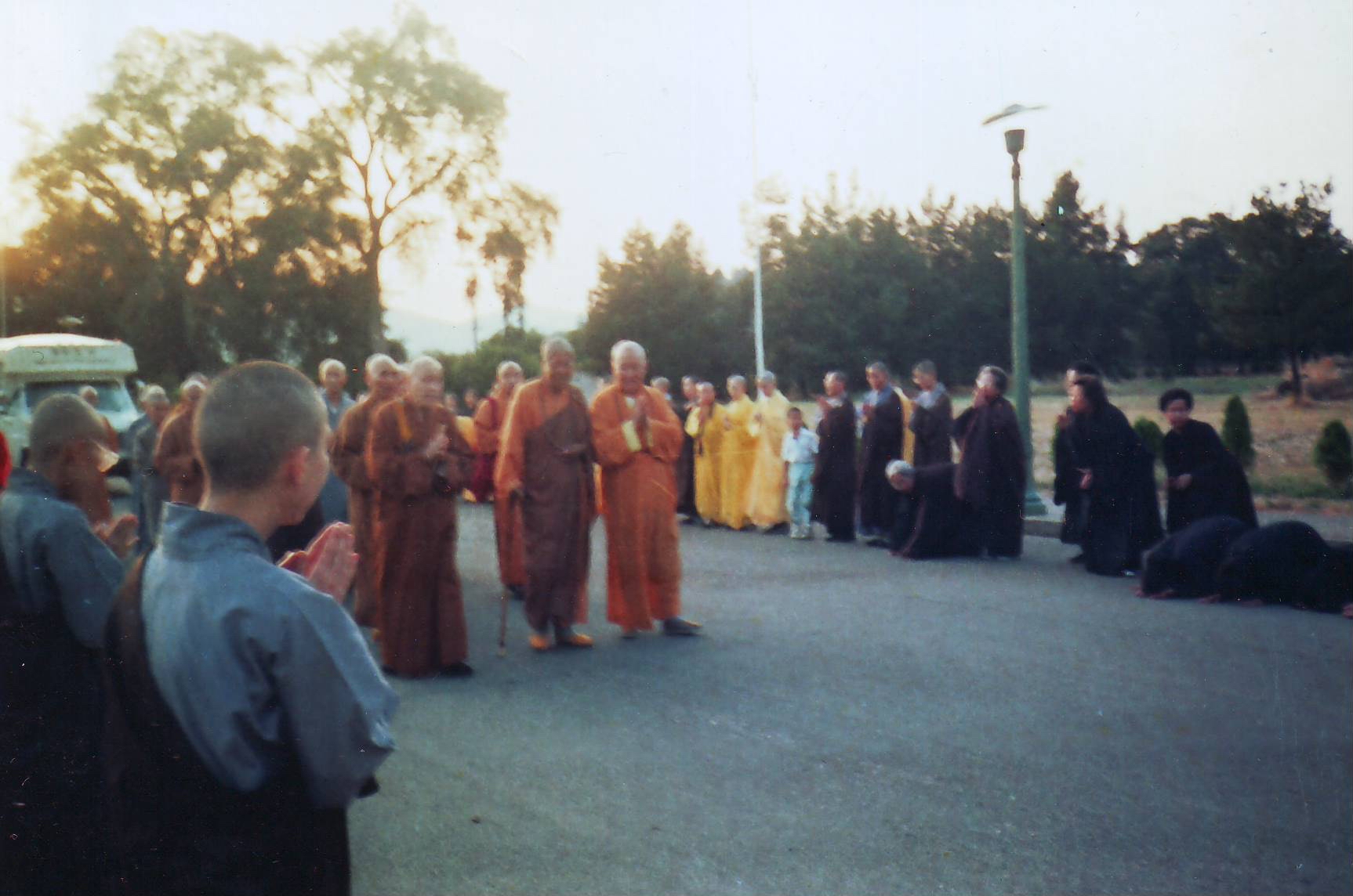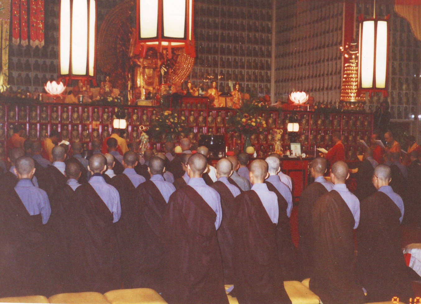1992年9月中国法师为美国万佛城举行传戒法会时,参加受戒的各国新戒在进行“受幽冥戒”仪式