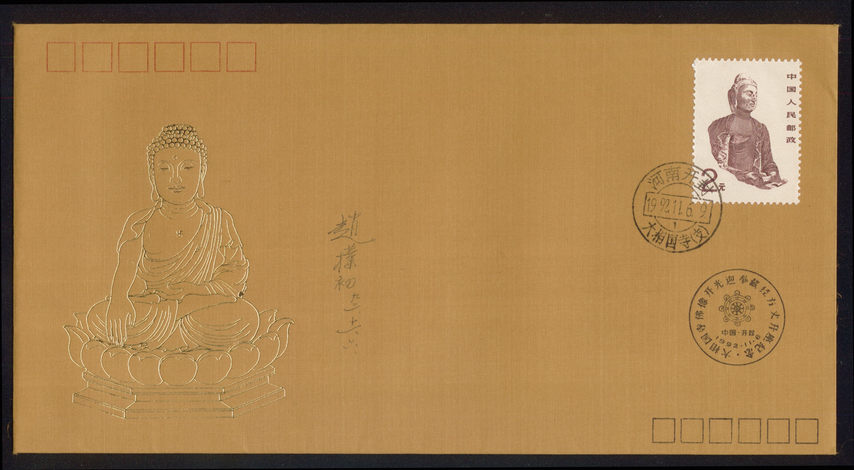 为大相国寺落成、开光、升座特制丝绸纪念封——赵朴初签名
