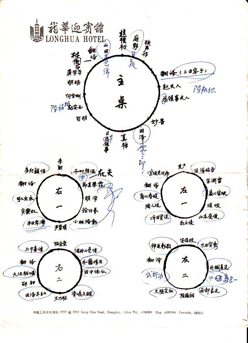 1993年5月21日为日本三长老祝寿演出八仙上寿”(前排左起:龚学平、翻译、山田、赵朴初、庭野、张声作)