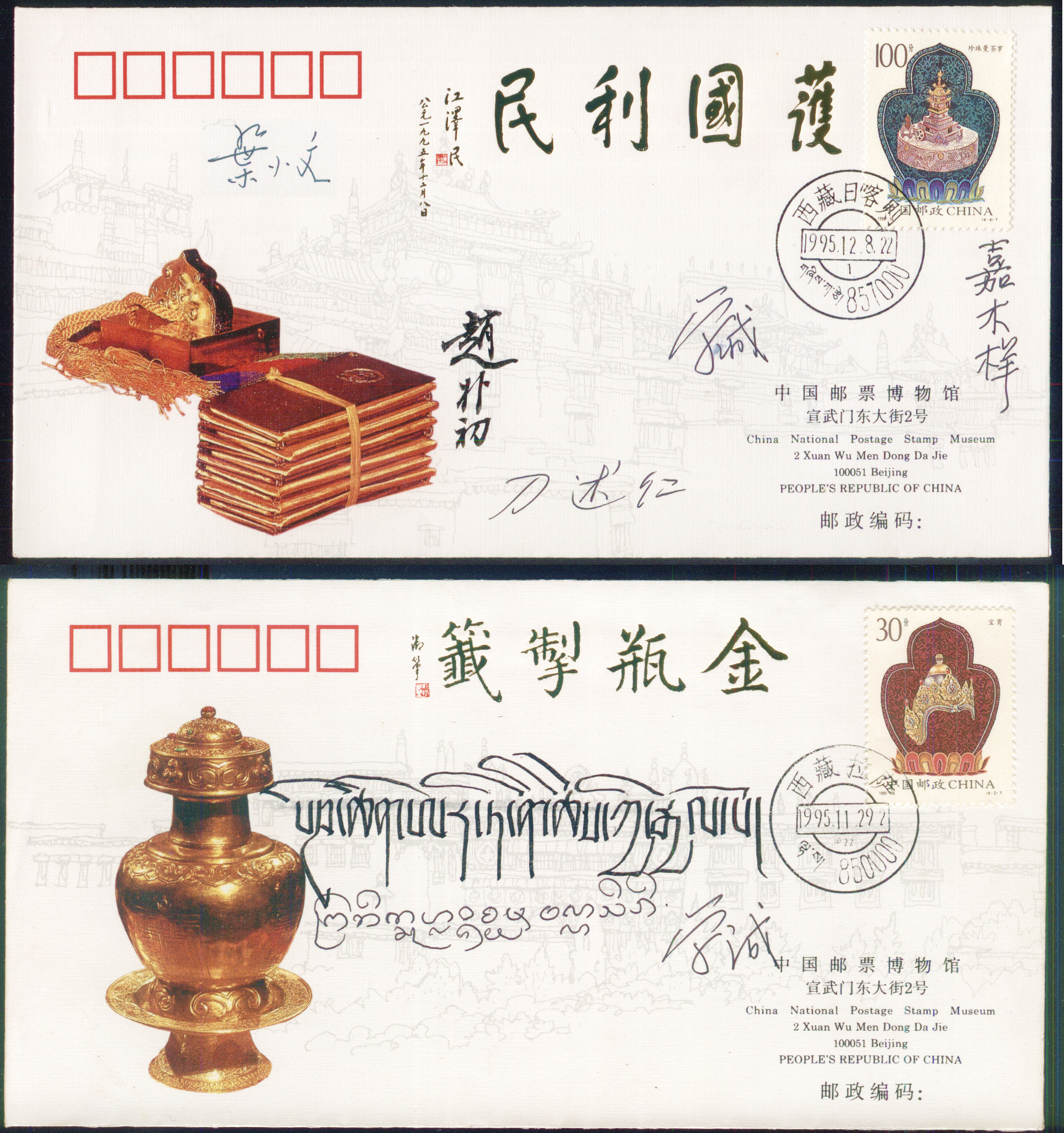 作者收藏的金瓶掣签首日封(国务院颁金印、金册)——十一世班禅签名