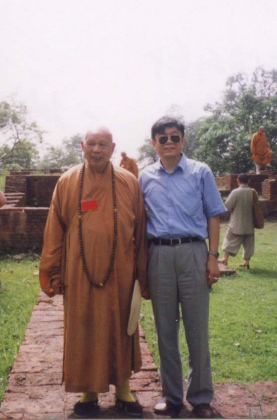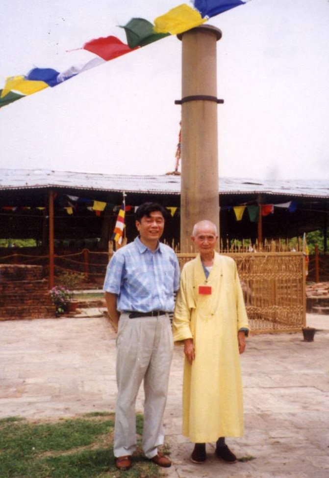 2000年5月26日,与重庆惟贤法师在蓝毗尼阿育王柱前